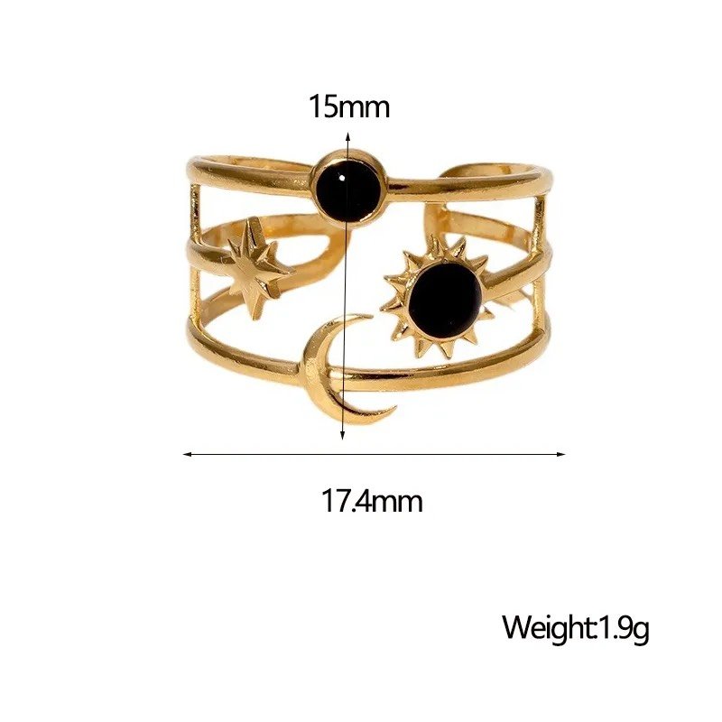 A sleek open ring with black stones and moon–star accents, designed to add a bold yet elegant touch to everyday and evening looks. Anti-tarnish, hypoallergenic, and adjustable for a perfect fit.