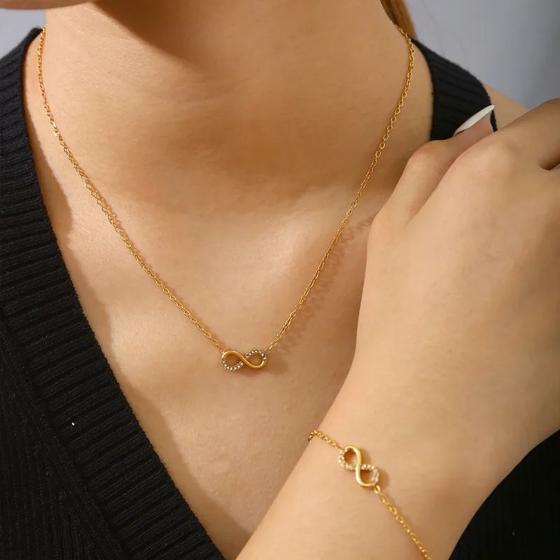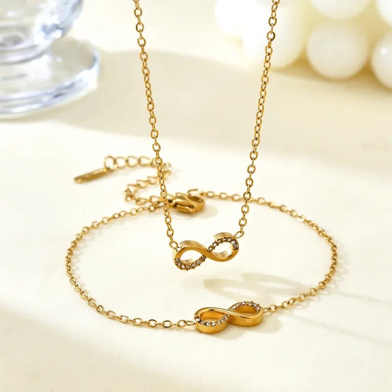 A delicate infinity necklace and bracelet duo with subtle sparkle, designed for effortless everyday elegance. Crafted from anti-tarnish stainless steel with a radiant gold finish, this lightweight set adds a timeless touch to any look. ✨