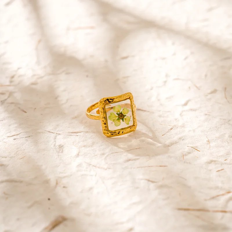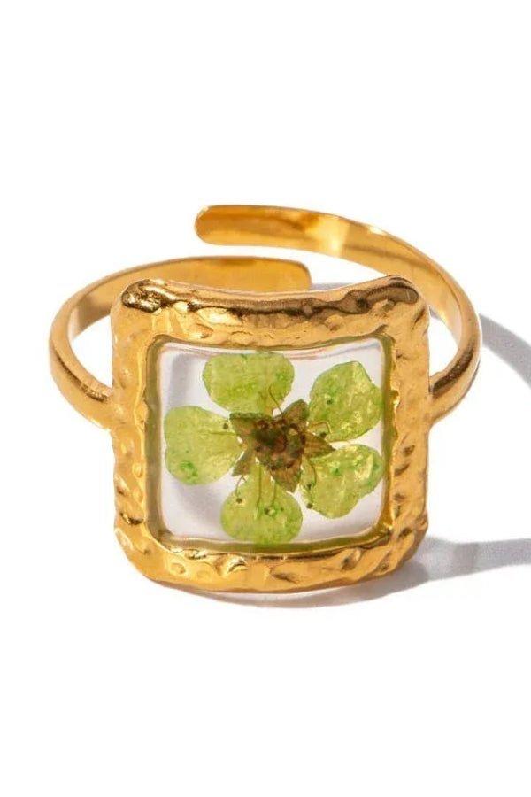 Encased in a textured gold frame, this green botanical resin ring captures the calm of a meadow in miniature. A statement piece that feels earthy, unique, and effortlessly stylish.